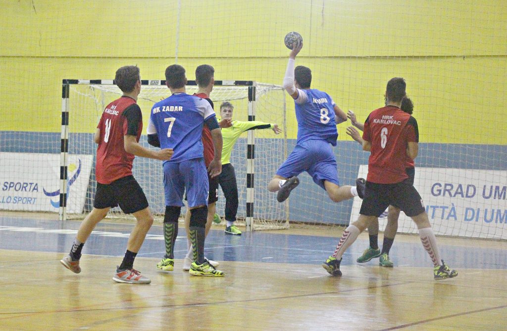 Nakon što je Domjančić upisao prvu obranu, Karlovac u vodstvo dovodi Jakov Makarun. Brze izmjene napada s istekom šeste minute rezultirale su vodstvom Karlovca 4:6. Obje ekipe ubrzavaju tempo utakmice i pokušavaju nametnuti svoj ritam, a do polovice pada 19 golova (8:11). Iako su Karlovčani većinu prvog dijela imali prednost, Zadar ulaskom u posljednjih pet minuta izjednačava (12:12), a na odmor odlaze s golom više (14:13). Makarun s početkom drugog poluvremena donosi novo izjednačenje, ali Zadar uzvraća pogotkom Patrka za ponovno vodstvo. Situacija se brzo mijenja, a Karlovac u 33. minuti ima +3 (16:19). U sljedeće tri minute Klarica i Patrk zabijaju za novo izjednačenje. U posljednjih pet minuta ulaze s 23:23, a Karlovac s igračem manje zabija za vodstvo. U nastavku Domjančić skida loptu Zadru, a Karlovac iskorištava priliku za +2. Iz sjajnog susreta nitko ne izlazi kao pobjednik (27:27). Najefikasniji kod na strani Zadra bio je Klarica sa deset pogodaka, a iz redova Karlovca Ivan Rukavina sa sedam.