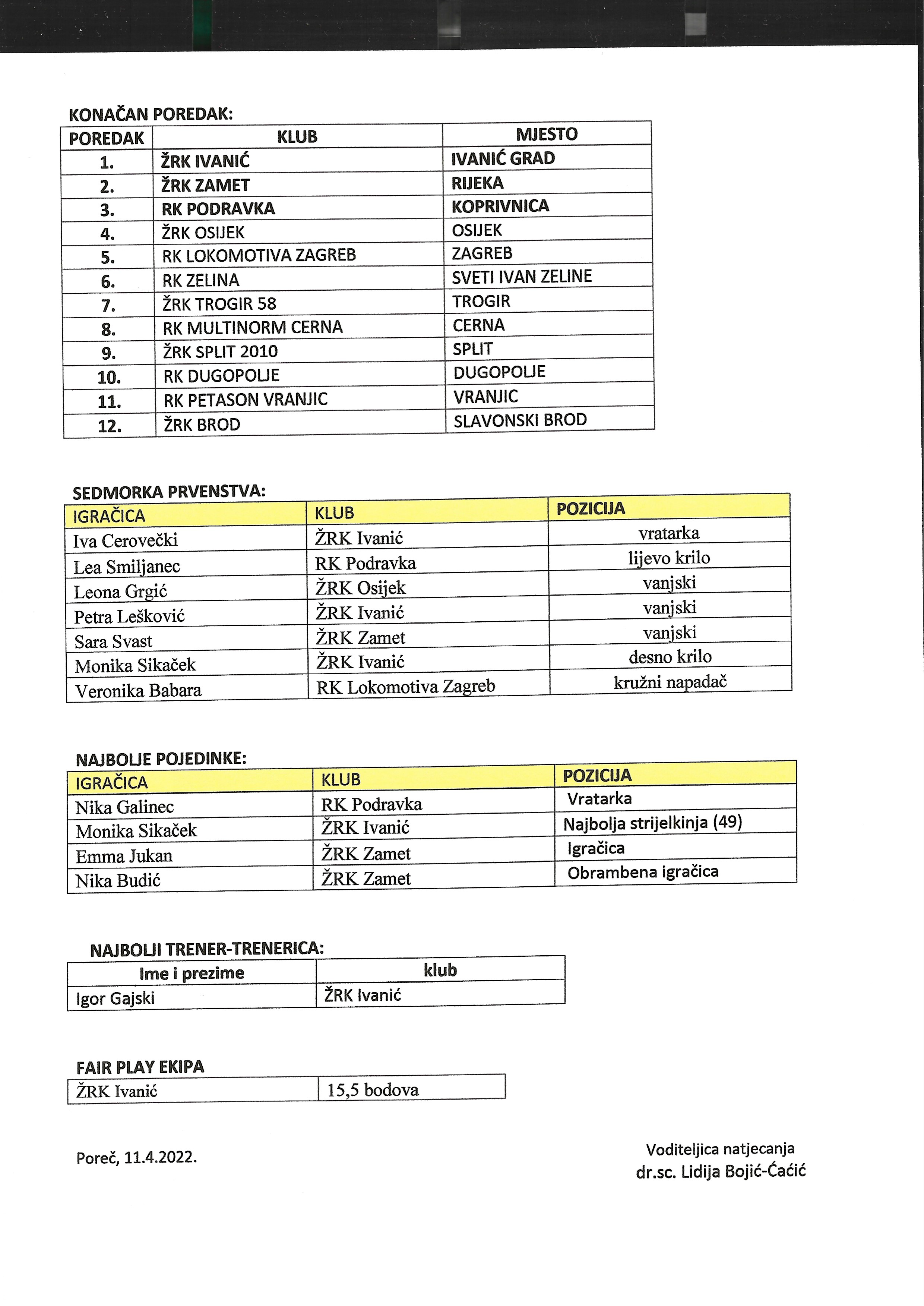Voditeljica natjecanja Lidija Bojić-Ćaćić “u ime HRS-a zahvalila se gradu Poreču te gradonačelniku g. Peršuriću na odličnoj suradnji i uvjetima koje rukometašice i rukometaši imaju u Poreču. Naglasila je da su protekle dvije godine natjecanja u ligama HRS-a bile iznimno izazovne za sve sudionike zbog COVID-19 epidemije te velikog broja odgođenih liga i utakmica. Uz pomoć roditelja i uz veliki angažman klubova i trenera igračice su nastavile trenirati te izborile i ovu Završnicu. Hrvatski ženski rukomet ima kontinuitet rada, veliku podršku u HRS-u te je i dalje najmasovniji ženski sport u Hrvatskoj”.