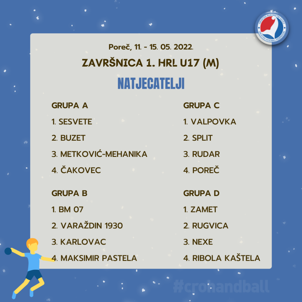 Rukometni svibanj ide dalje svojim tijekom, a vrhunac rukometne sezone došao je i za naše U17 mladiće koji će od 11. do 15. svibnja u Poreču odigrati svoju Završnicu. Nakon kraja Završnice 1. HRL U14 za djevojke u kojoj su sve tri medalje otišle put Dalmacije, vrijeme je da saznamo tko će postati novi U17 prvaci i odnijeti titulu najboljih u državi.