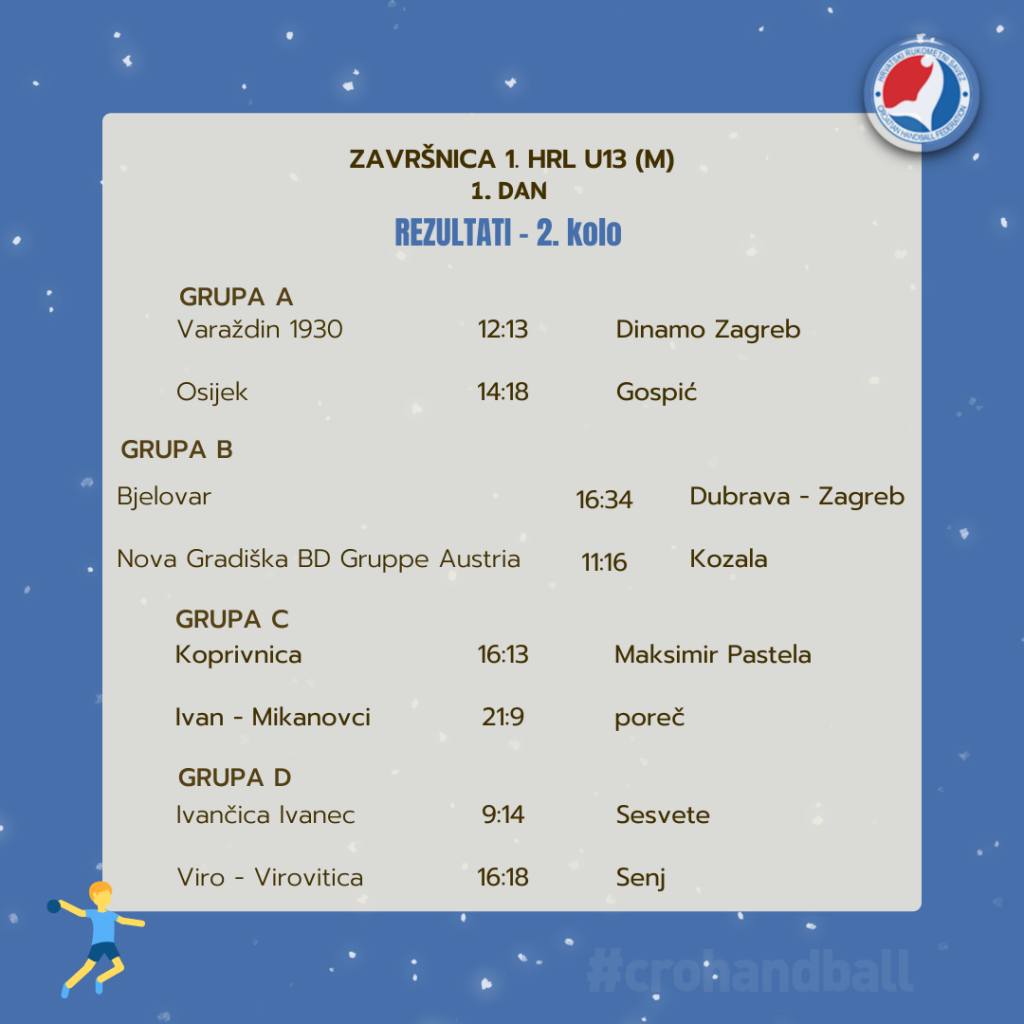 U prvom kolu danas smo zabilježili izjednačenje između Zadra 2013 i Dubrave Zagreb, 15:15, dok je Kozala sa 17:16 pobijedila Bjelovar. U nastavku, Dubrava je baš protiv Bjelovara zabilježila jako uvjerljivu pobjedu s dvoznamenkastom prednošću, 16:34.