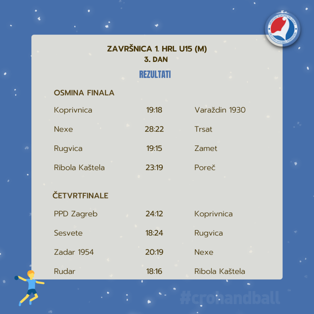 Igrači Zadra 1954 su u izjednačenoj utakmici koja se uglavnom igrala pogodak za pogotkom, s jednim golom razlike svladali Nexe i osigurali ulazak u polufinale. Završilo je 20:19. Čak osam zadarskih pogodaka postigao je Bartol Mikuljan. Jedan manje u redovima Nexea djelo je Karla Božića. Rudar je protiv Ribole Kaštela vodio cijelu utakmicu i na kraju slavio s 18:16, a zanimljivo je da su se samo tri igrača Rudara upisala u strijelce: Fran Martinko 10 golova, Patrik Mataić sedam i Dorian Gorički jedan pogodak. Berislav Antonio Tokić i Viktor Josipović postigli su po četiri pogotka u dresu Ribole. PPD Zagreb je nastavio svoj pobjednički niz uvjerljivo svladavši Koprivnicu 24:12. Prvo ime u redovima mladih Zagrebaša bio je Mihael Hanaček sa šest zgoditaka. Kod Koprivnice najbolji David Udovičić s četiri pogotka. Rugvica je bez većih poteškoća pobijedila Sesvete 24:18 i osigurala svoje mjesto u polufinalu. Predvodio ih je Nino Ivaković s osam golova, dok su Josip Tomić i Franko Pomper postigli po četiri kod Sesveta.