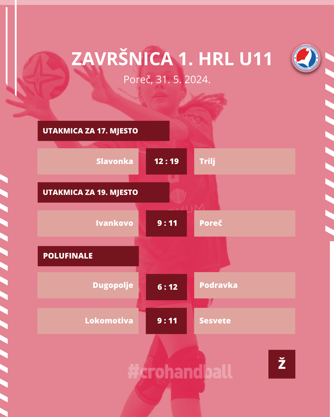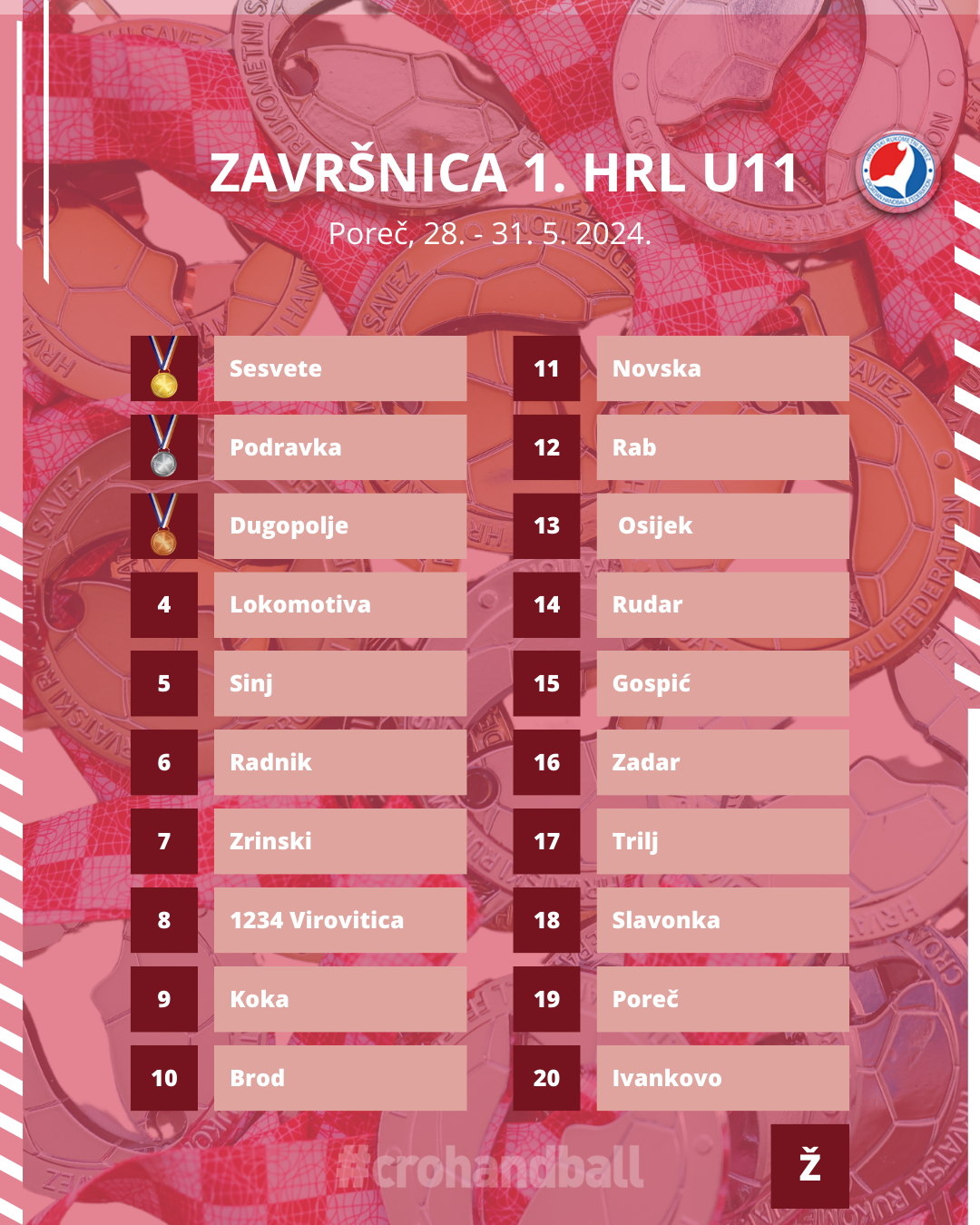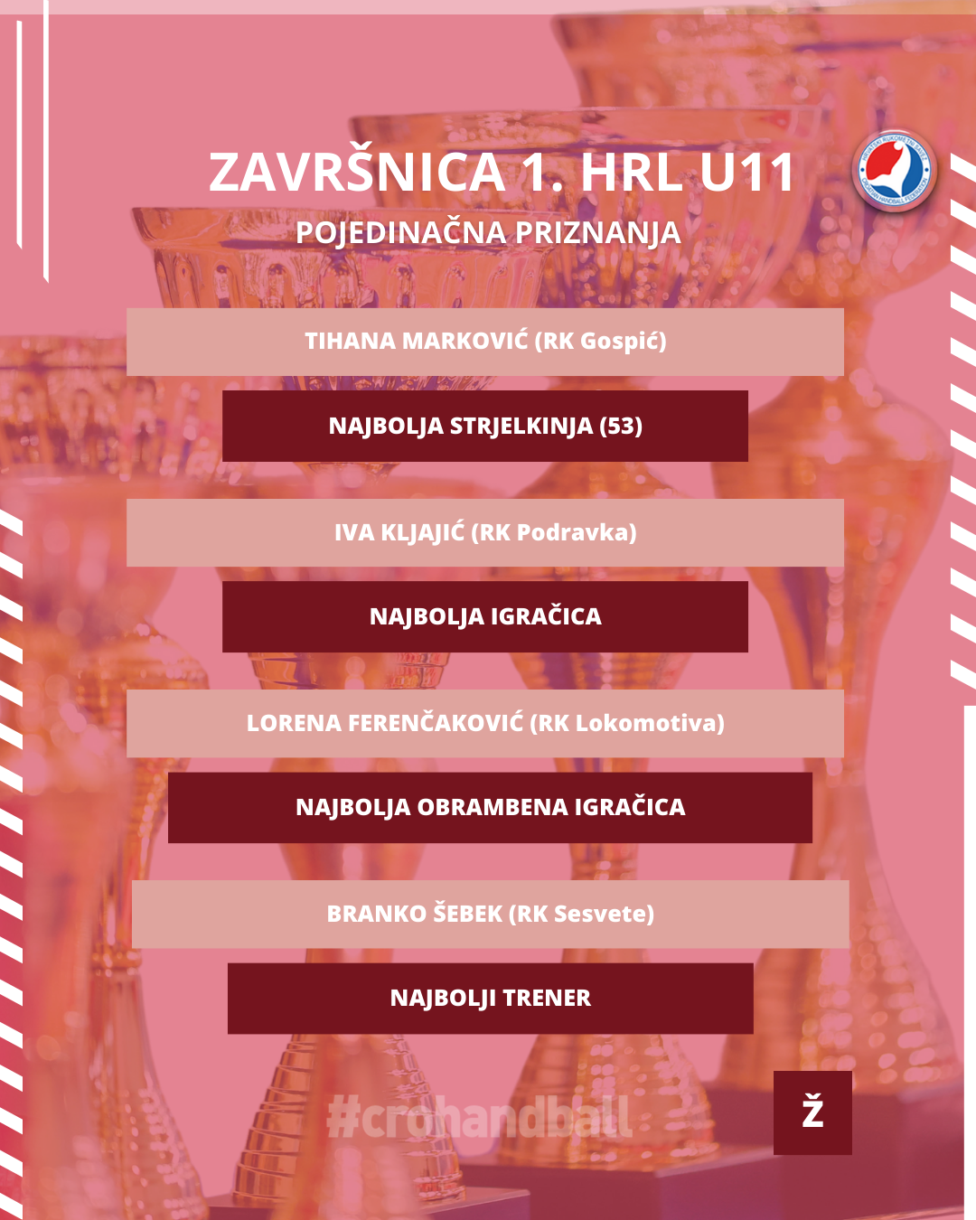 Ovim putem želimo čestitati svim sudionicama ove Završnice na trudu i zalaganju u svakoj utakmici. Bilo je divno pratit vas u ova 72 odigrana susreta. Posebne čestitke idu svim osvajačicama medalja, najboljoj sedmorci i najboljim pojedinkama. Želimo vam sretan put kućama i nadamo se da se vrlo brzo vidimo na JANAF Kampu HRS-a u Umagu.