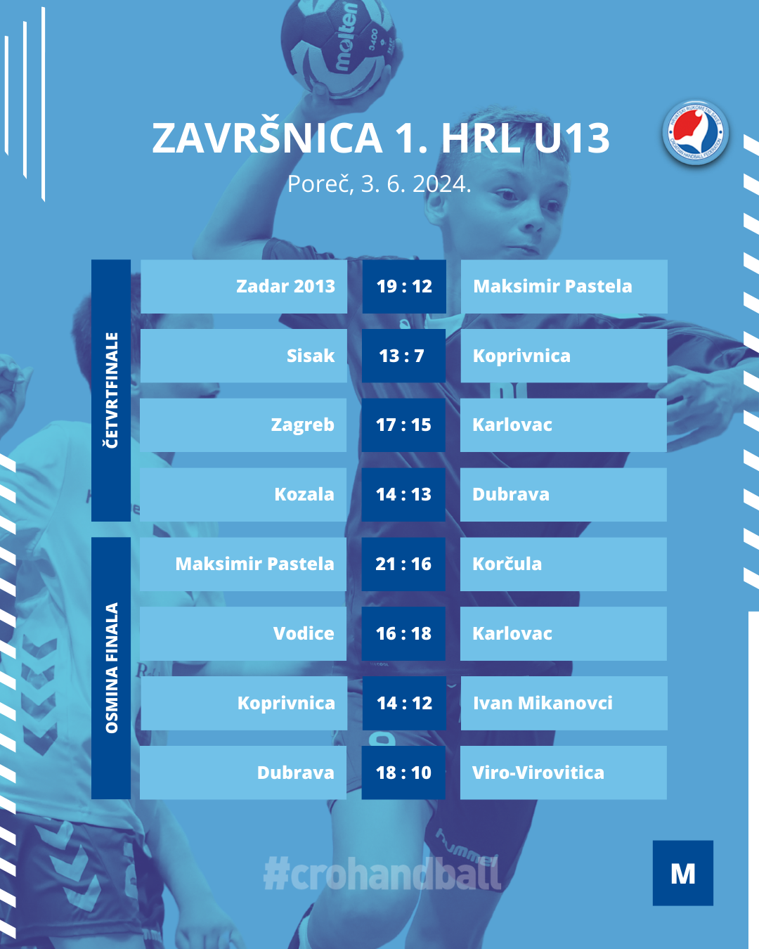 Nakon pauze za ručak i kratkog odmora, mladi rukometaši vratili su se u Žatiku i krenuli s četvrtfinalnim susretima. Zadar i Sisak bili su uvjerljivi protiv svojih protivnika. Ekipa iz Zadra bila je bolja od Maksimir Pastele. a Sisak je pobijedio Koprivnicu. Preostale dvije utakmice bile su ipak neizvjesnije. Zagreb je pobijedio Karlovac, a Kozala je nakon boljeg izvođenja sedmeraca slavila protiv zagrebačke Dubrave.
