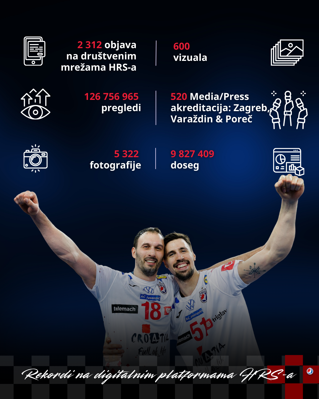 Na digitalnom terenu, nikad veći doseg, nikad više pregleda, reakcija i interakcija! Naši profili na društvenim mrežama postali su središte navijačke euforije, optimizma i zajedništva, a brojke koje smo ostvarili potvrđuju snagu hrvatskog rukometa, ne samo na terenu, već i u digitalnom svijetu. Od 2. siječnja i prvog dana priprema za Svjetsko prvenstvo pa do 9. veljače 2025. godine i zadnje objave posvećene svjetskoj smotri, medijski tim HRS – a producirao je ukupno 2 312 objava na Facebooku, Instagramu. X-u, TikTok-u, YouTube-u i webu. Ukupan pregled objava je 126 756 965 pregleda, dok je organski doseg procijenjen na 9 827 409. Objavljeno je 600 vizuala i infografika, izrađene 5 322 fotografije. Brojni videozapisi postali su viralni u rekordnom roku, a ekskluzivan Behind the scenes sadržaj iz Mix zone, slavlje s navijačima u dvorani ili pak, putovanja reprezentacije, privukao je izniman interes na digitalnom tržištu. Sretni smo i zahvalni jer nas je rukomet sve inspirirao u skladu s hashtagom Svjetskog prvenstva #inspiredbyhandball.