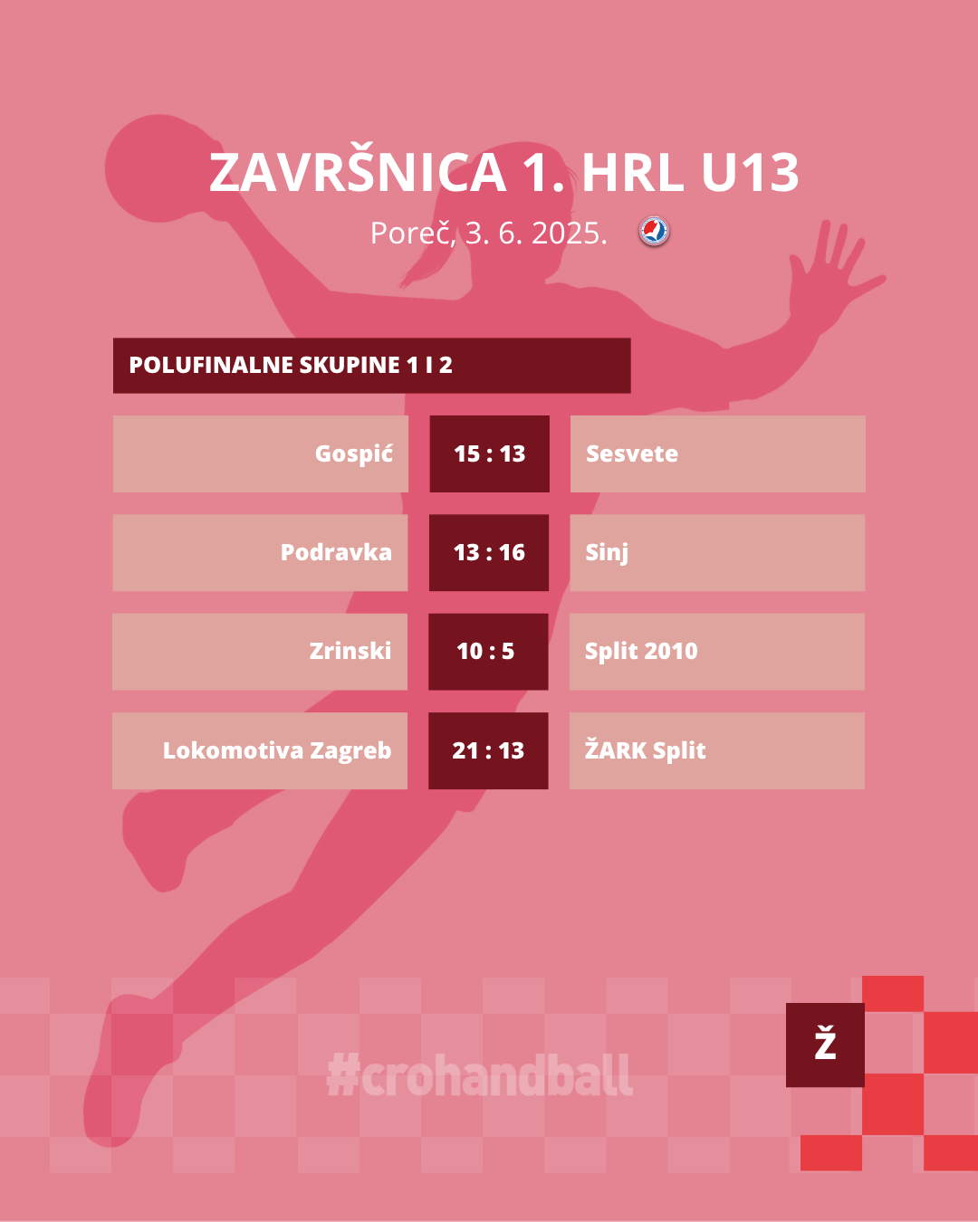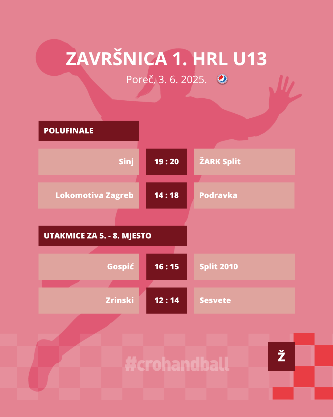 Stigli smo do kraja trećeg dana uzbudljive porečke Završnice za rukometašice do 13 godina i saznali smo koji će klubovi u borbu za medalje. Svoje mjesto među četiri najbolje ekipe osigurale su ekipe Sinj, Podravka, Lokomotiva Zagreb i ŽARK Split. Na kraju dana pratili smo polufinalne susrete, a oni su nam otkrili da će u borbu za zlato Podravka i ŽARK Split, dok će se Lokomotiva Zagreb i Sinj boriti za treće mjesto i broncu. Finale je na rasporedu u srijedu, 4. lipnja u 14:00 dok će se utakmica za treće mjesto odigrati nešto ranije, točnije u 12:30, a sve će biti u prijenosu uživo na Sportskoj televiziji. No prvo, evo kako je protekao treći dan.