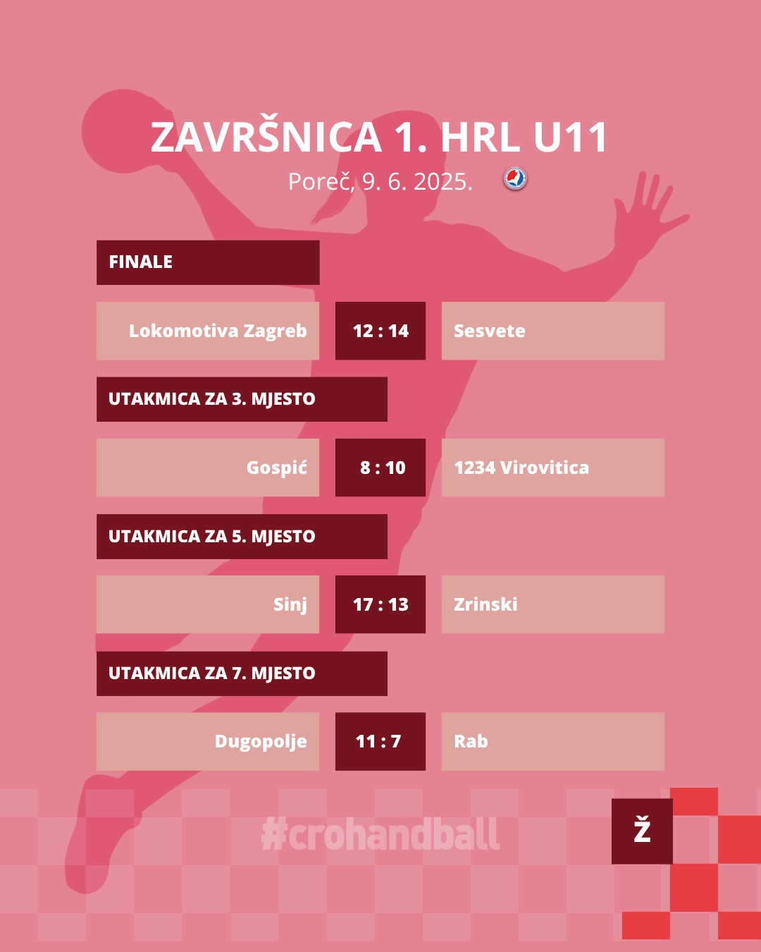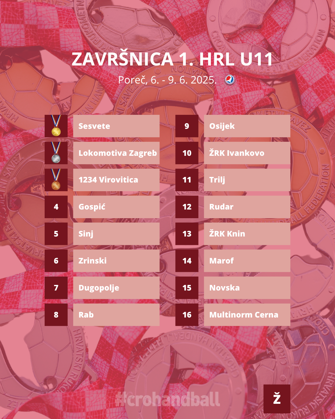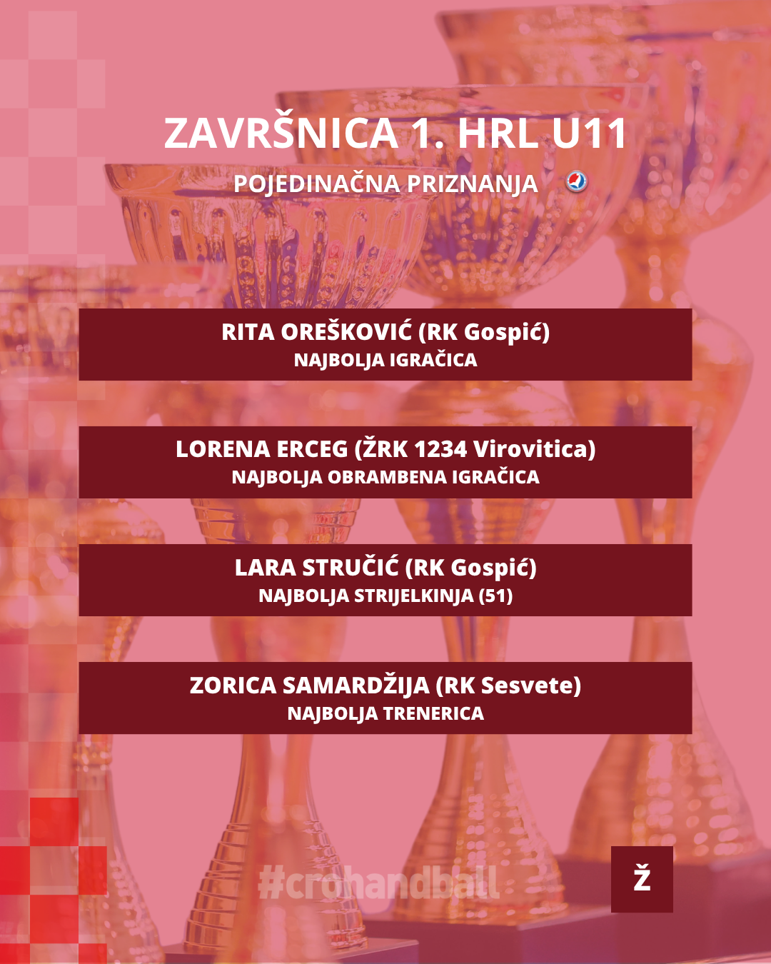 Zaključena je i posljednja ovosezonska završnica za rukometašice. Nakon četiri dana i pregršt utakmica, saznali smo tko su najbolje hrvatske rukometašice do 11 godina. Kao i prošle godine, to su rukometašice Sesveta koje su u sjajnom finalu i gradskom derbiju nakon napetih 30 minuta pobijedile Lokomotivu Zagreb. Treće mjesto osvojila je 1234 Virovitica. Nakon velikog finala, a prije dodjela medalja, podijeljene su i pojedinačne nagrade. Najbolja igračica završnog turnira je Rita Orešković iz RK Gospića, a iz istog kluba dolazi i najbolja strijelkinja, Lara Stručić. Najbolja obrambena igračica je Lorena Erceg iz 1234 Virovitice. Naravno, izabrana je i najbolja trenerica, a to je Zorica Samardžija iz Sesveta.